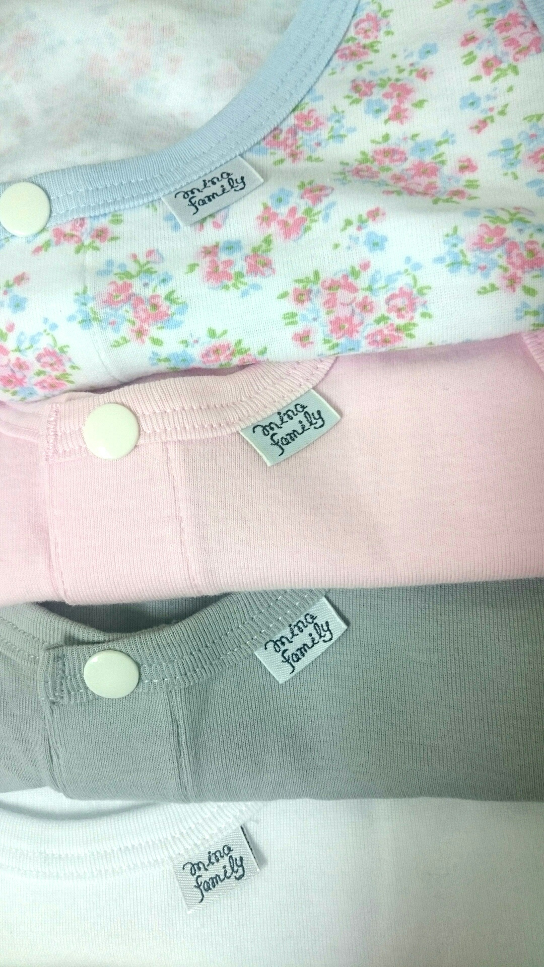 色柄はベーシックな4タイプ、形はかぶりロンパース・前開きロンパース・前開きタンクトップの3タイプ。